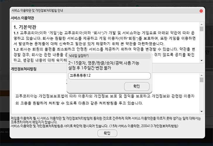 서비스 이용약관에 대해 나오게 되며, 닉네임을 설정하게 됩니다. 자신이 자주 하는 닉네임이 있거나 아무거나 해주셔도 상관 없습니다. 자유롭게 지정해 주신 후 확인을 눌러보세요.
