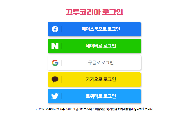 로그인하는 방법은 총 다섯가지가 있습니다. 별도로 가입절차를 진행하기 보다 접속을 해 동의를 한 후 로그인을 하게 됩니다. 요즘 간소화 된 로그인 방식 중 하나이지 않을까 싶습니다. 페이스북, 네이버, 구글, 카카오, 트위터 등 편하신 부분으로 접속을 해주세요.