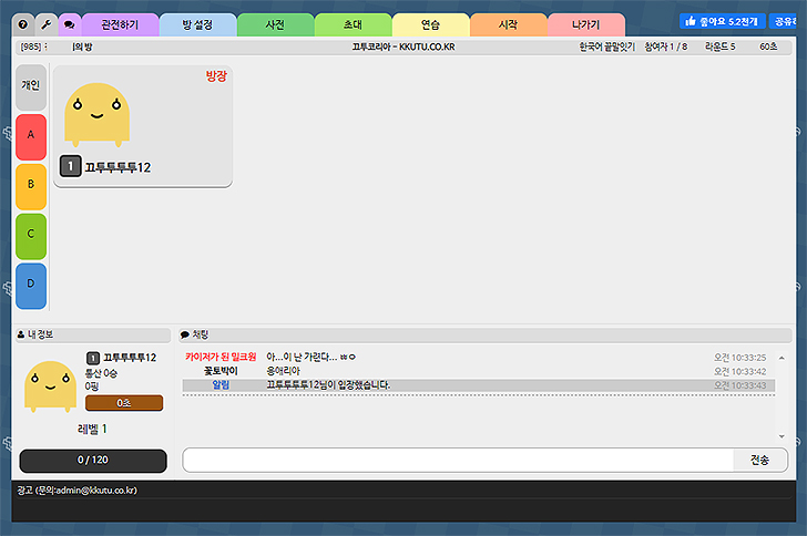 이렇게 만들어 졌다면, 왼쪽의 개인 혹은 팀전이라면 색깔을 지정해 준 후 진행해 주시면 되겠습니다. 위에 관전하기, 방설정, 사전, 초대, 연습, 시작 등이 있으니 이 부분도 필요한 부분을 눌러 활용해 주시면 될 것 같습니다.
