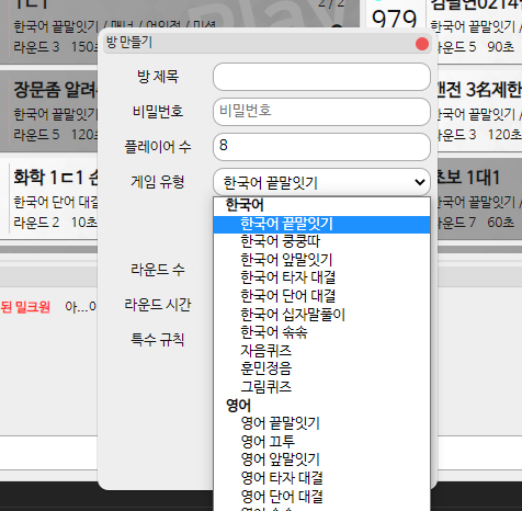 한국어로 하거나 다른 외국어로 할 수 있고, 방식도 그 안의 몇가지 있습니다. 쿵쿵따나 앞말잇기, 타자대결 등이 있습니다. 그 외에 필요한게 있다면 지정해 준 후 방을 만들어 보세요. 만들어 진 방으로 초대를 하거나 지인에게 알려주어 같이 즐겨주시기만 하면 됩니다.